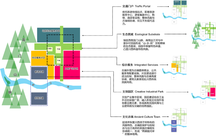 本次规划对新场的设计从意向和功能两个维度上寻求古镇的绮丽转型,以“古蜀水鄉,电影新場”为主题,以建设国家级历史文化名镇、中国电影小镇、西部文创特色镇、川西坝上风情水乡为目标。在意向上按照“全域规划、镇乡互融”的原则打造“显山、露水、敞田”的川西坝上风情水乡;在功能上以文化旅游、影视博览与创作、田园休闲观光为主题,实现“影游结合、文旅互动”,打造都市休闲体验目的地。最终绘制出“傍水依山田园透,古镇丽影旧时新”的新场新画卷。