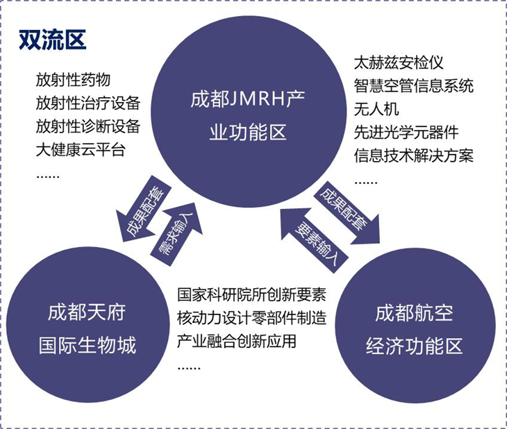 规划统筹利用双流区存量资源,打破功能区物理空间,与天府国际生物城、航空经济功能区形成三个功能区的区域协同,实现产业上下游衔接配套。