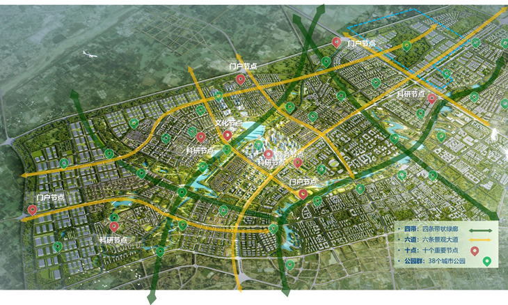 在城市生态景观建设方面,规划以杨柳湖公园为核心,高生态、高品质的公园城市典范为目标,构建“四带、六道、十点、三片、公园群”水绿交融的景观体系,打造”透风见绿、簇群错落”的城市空间秩序。