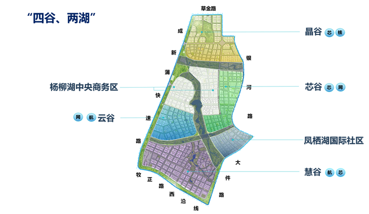 两湖:杨柳湖中央商务区、凤栖湖国际社区;