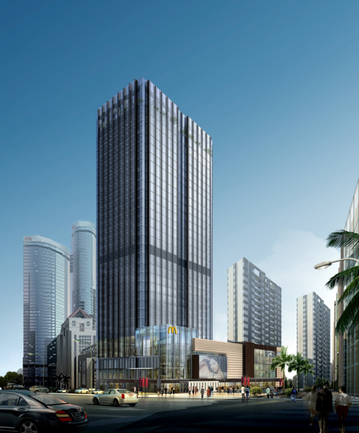 建筑位于成都市龙泉驿区世纪广场的东北方向,塔楼包括会议厅,办公空间以及拥有229间客房的酒店,底层三层为商业中心。通过多方面对比设计,在综合考虑建筑退界、城市形象、交通组织以及对附近建筑日照影响等多方面因素之后,决定选择单塔方案设计。这样既可将建筑有效面积比做到经济合理,在体量上也更为挺拔雄伟,符合本项目城市标志性建筑的定位。