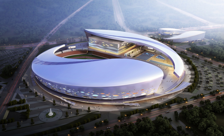 新津被誉为“水城”,常言道:水是生命的源泉;生命在于运动。故而在本次体育中心设计时我们将流水的动感形态反映在其中,让地块整体设计形成水流螺旋的拓扑空间,将体育场、体育馆和游泳馆三馆合一,资源共享的同时也成为人群互动交流的中心。建筑形态和总体构思一致,设计为螺旋向上的动态,主体采用悬索结构方式,屋面有半透明流线型采光带,立面用索网编织出波纹状双曲弧面,呈半透明状,内衬看台底板和索网采用鲜艳色彩,在外部看来层次感、立体感强烈。