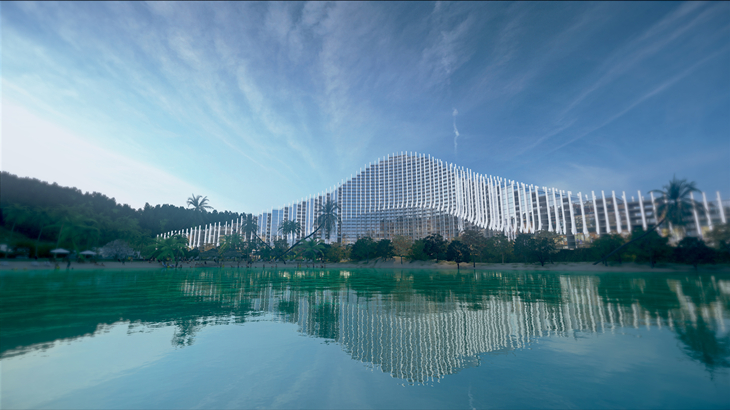 运用流线型的表面,同时从建筑的角度满足酒店的需求并提供公共入口。酒店内客房的安置意在提供高效率的场内路线,与周围形成合理的关系,而不同容积的房间的设计和安置利用了地皮的自然起伏。游客从酒店的大堂和公共广场得以径直进入主体建筑。屋顶游泳池毗邻附近的水域,设计为一个弧形,作为室外星空房场地。