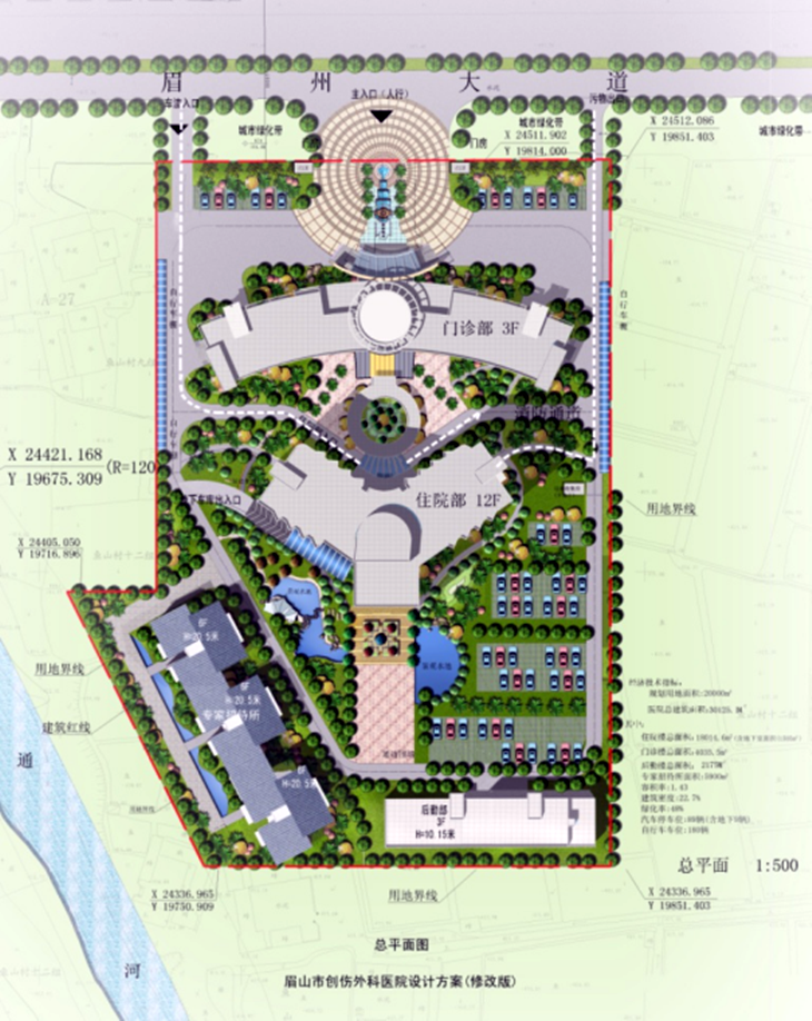 眉山市创伤外科医院为三甲综合型医院,位于眉山市眉州大道南侧。基地地貌开阔,地势平坦,交通方便,是医疗建筑的理想用地,总规划用地约为30亩。