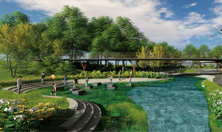 通过表征水脉、绿脉、文脉、生态脉的景观设计元素展现一个生态的空间、艺术的空间、文化的空间、休闲的空间和一个永恒的空间,营造一个集文化休闲、亲子互动、康养健身、创意展示、文化交流于一体的生态环境,改善人居环境质量,满足彭州市人民对物质和文化生活不断提高的需要,形成南部新城时尚创意新文化的展示空间,构建服务于民、民园互动的综合性城市生态公园。